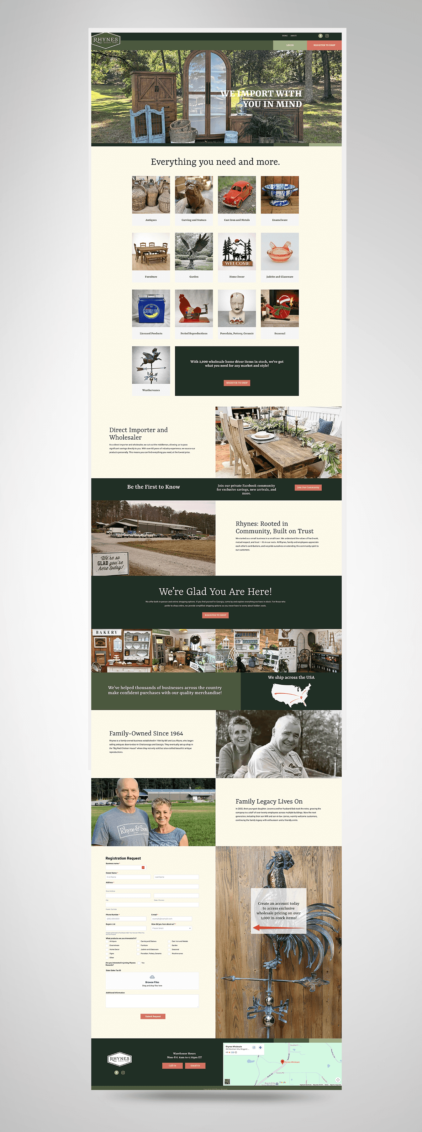 Rhynes Wholesale is a premier direct importer and wholesaler, offering a massive catalog of over 3,000 in-stock items ranging from antiques and furniture to garden accents and period reproductions.