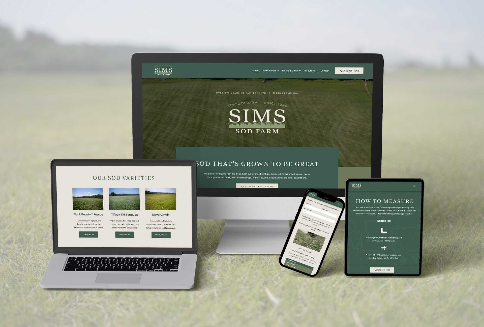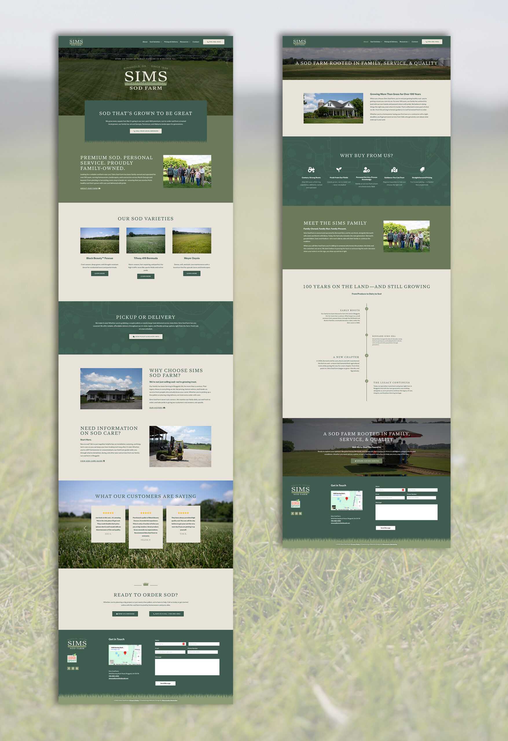 Riverworks Marketing designed and developed the website for Sims Sod Farm, elevating its online presence with a clear focus on product offerings, regional coverage, and educational content. The site spotlights premium sod varieties (Black Beauty Fescue, Tifway 419 Bermuda, Meyer Zoysia), details delivery and pickup service across GA, TN & AL, and offers helpful resources like a sod calculator, care tips, and FAQs. With strong visuals, trust-building storytelling about the family farm legacy, and prominent calls-to-action to order or contact, the site delivers a seamless experience that drives more sales from homeowners, landscapers, and contractors alike.